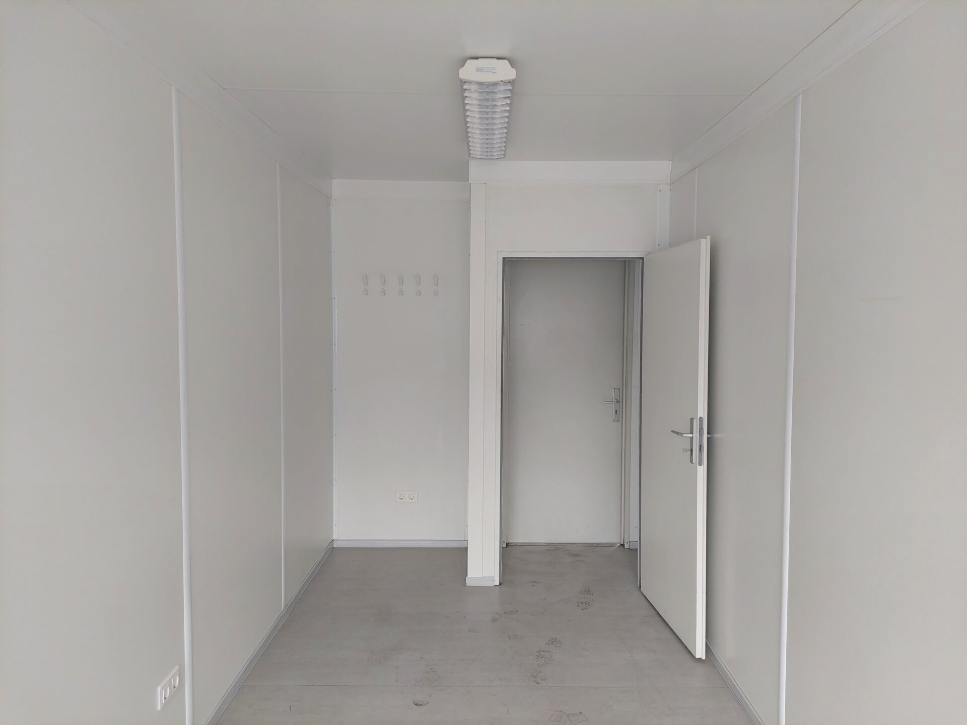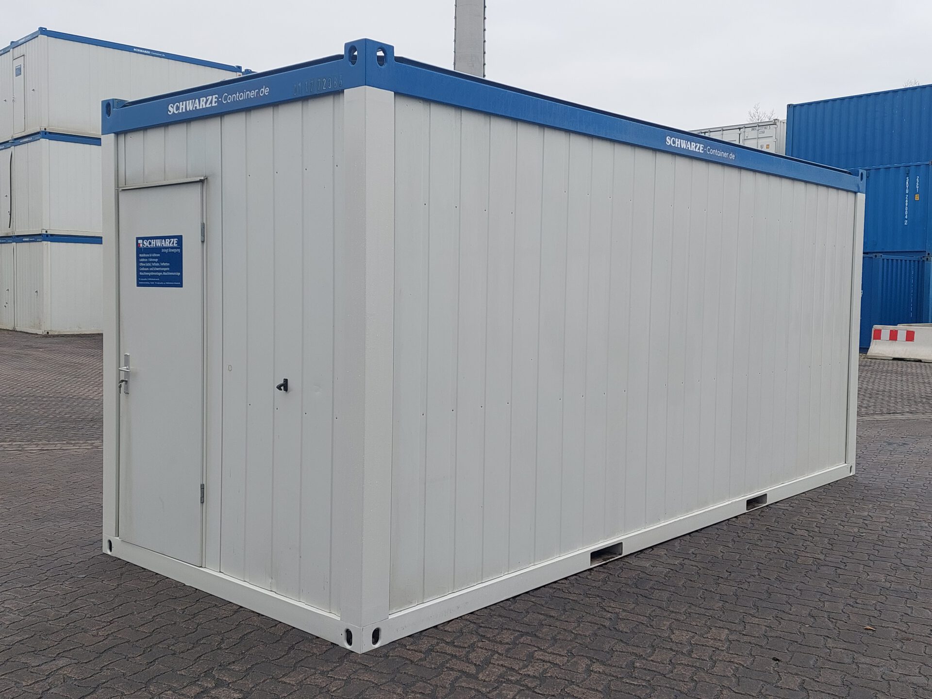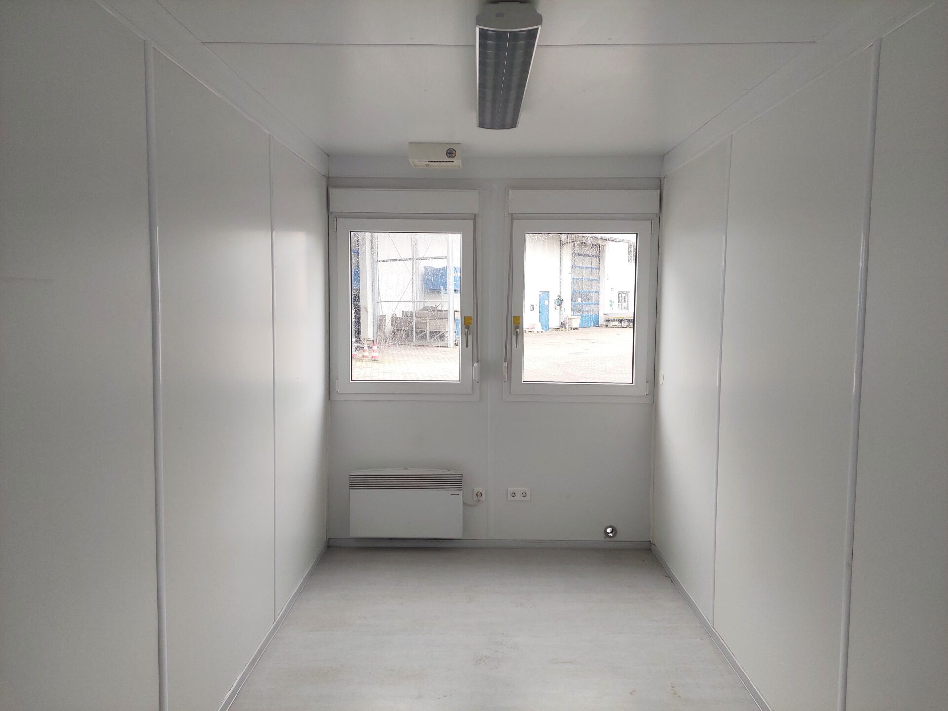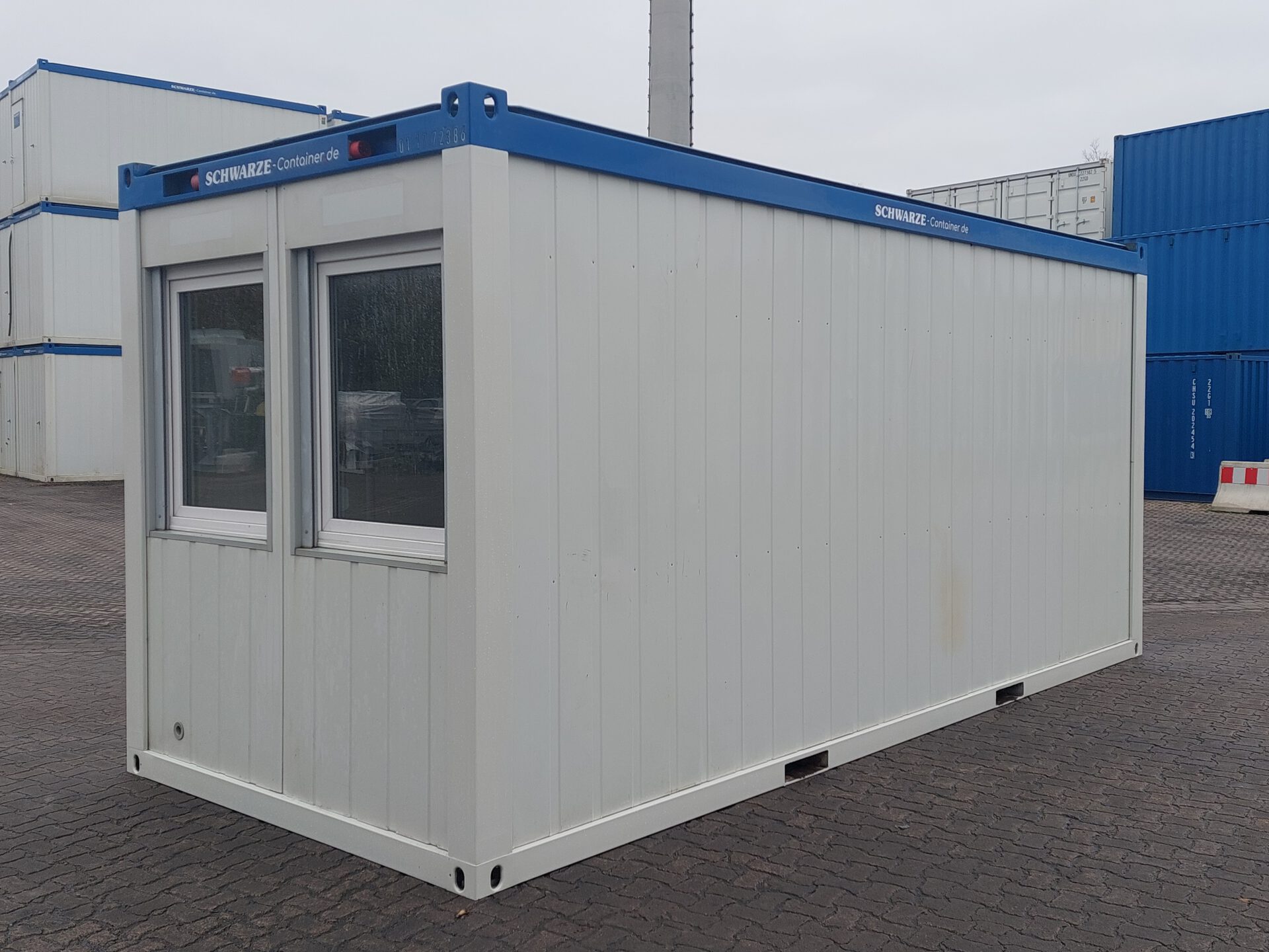 20′ Bürocontainer 011772386 gebraucht – Außenmaße LxBxH 6.055 x 2.435 x 2.800 mm – Außenlackierung grauweiß, Rahmen blau – Isolierung Wand Mineralwolle 100mm – 1 Außentür stirnseitig, mit Windfang – 2 Dreh-/Kippfenster stirnseitig – 2 Spiegelrasterleute – 1 Elektroheizung – ab Depot Garbsen