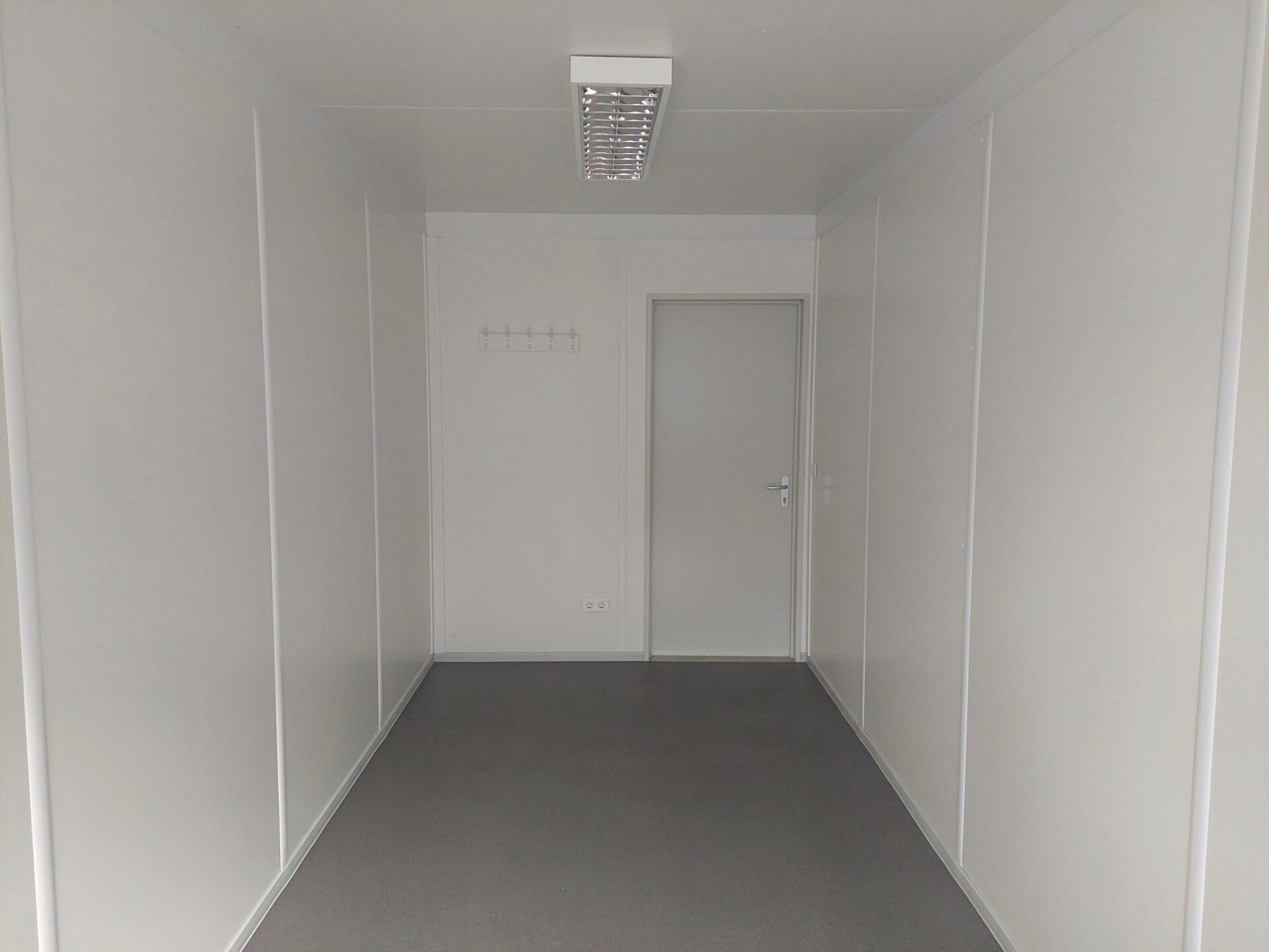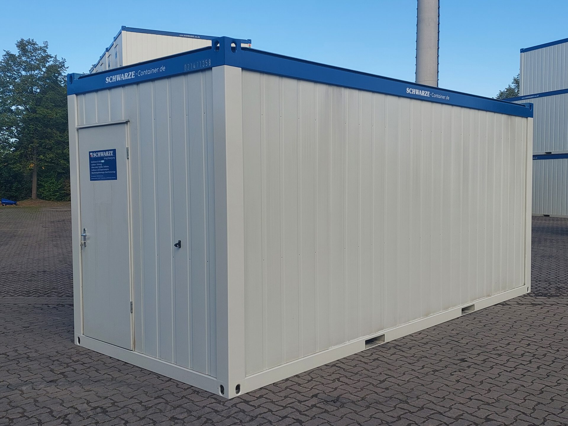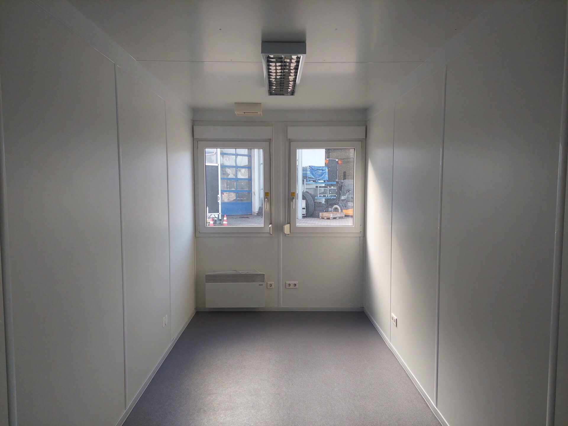 20′ Bürocontainer 021471358 gebraucht – Außenmaße LxBxH 6.055 x 2.435 x 2.800 mm – Außenlackierung grauweiß, Rahmen blau – Isolierung Wand Mineralwolle 100mm – 1 Außentür stirnseitig, ohne Windfang – 2 Dreh-/Kippfenster stirnseitig – 2 Spiegelrasterleute – 1 Elektroheizung – Bodenplatten & PVC neu verlegt (08/2025) – ab Depot Garbsen