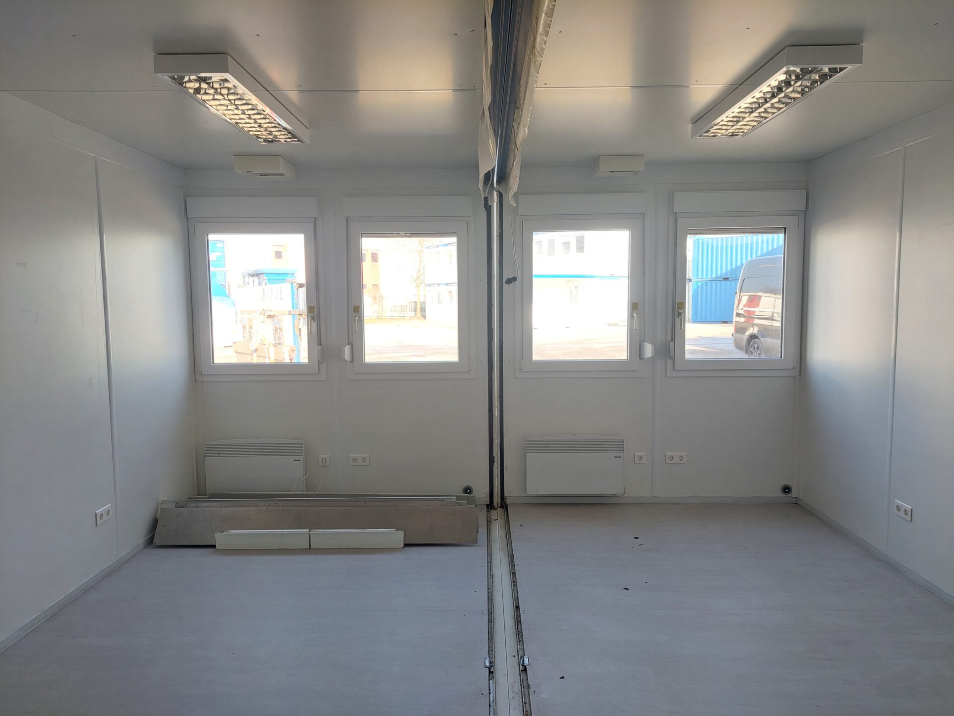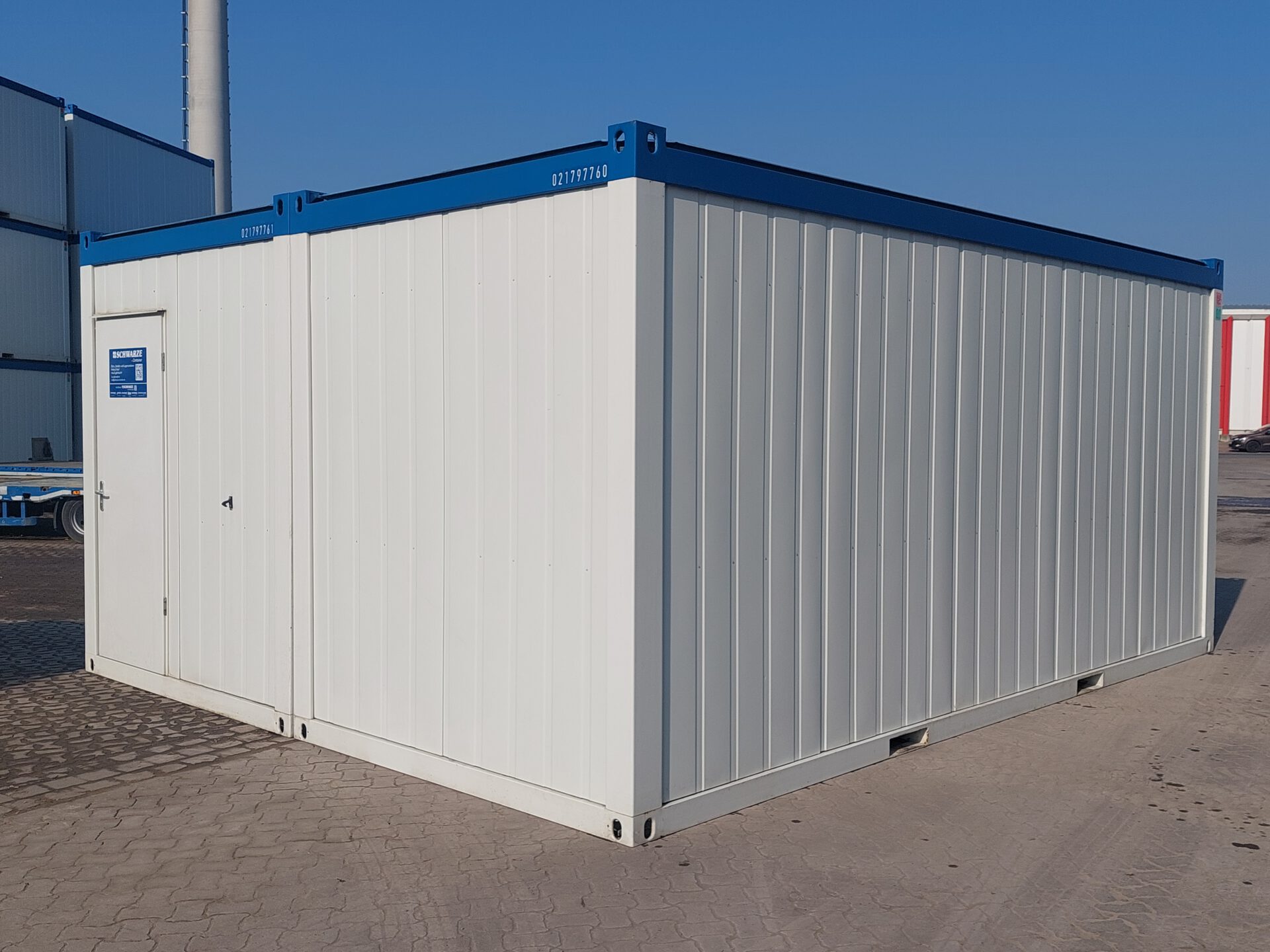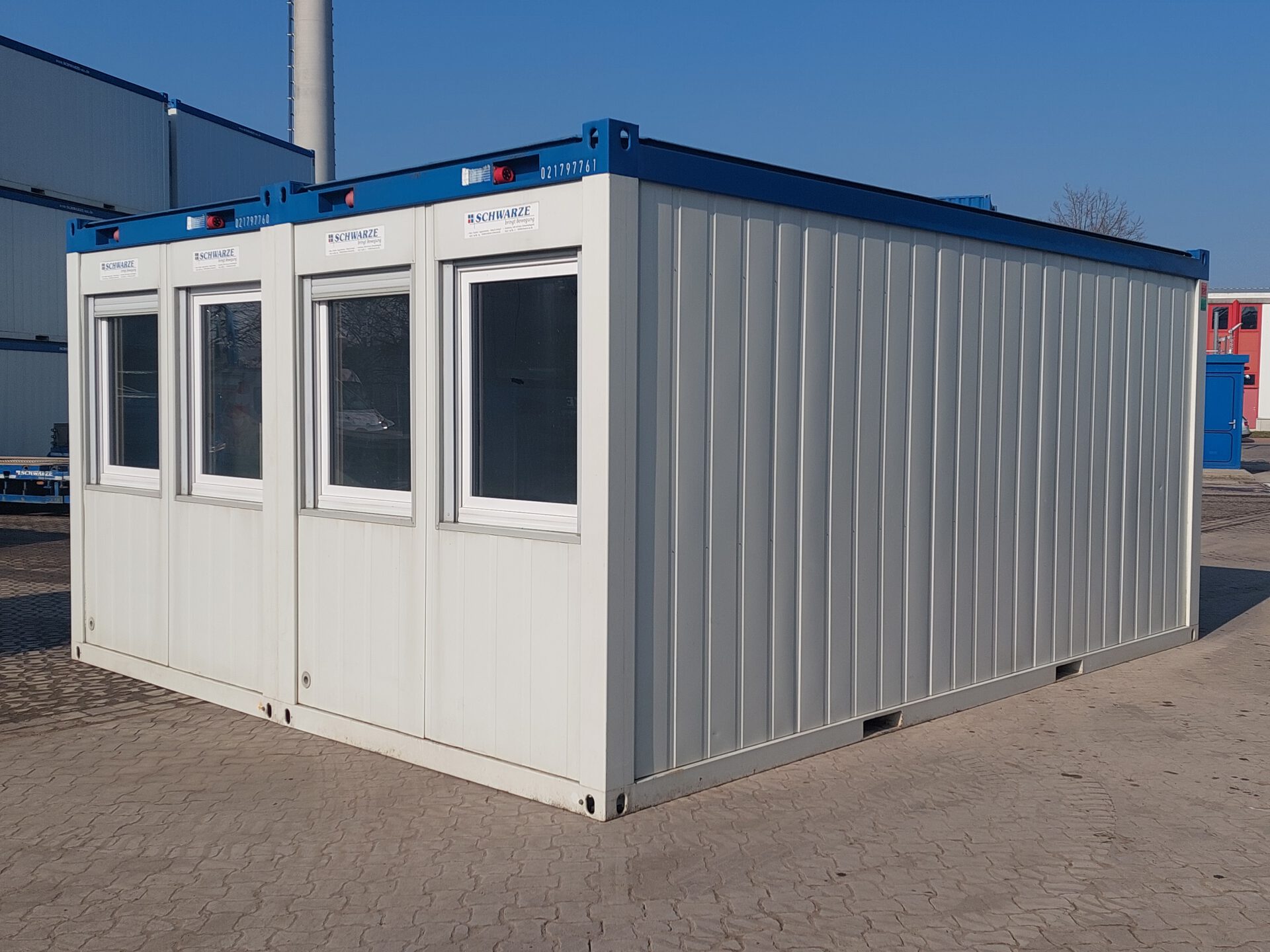 20′ Duoanlage 7760+7761 gebraucht – Außenmaße LxBxH 6.055 x 4.885 x 2.800 mm – Außenlackierung grauweiß, Dachgruppe blau – Isolierung Mineralwolle 100mm – 1 Außentür stirnseitig, mit Windfang – 4 Dreh-/Kippfenster stirnseitig – 4 Spiegelrasterleuchte – 2 Elektroheizung – ab Depot Garbsen